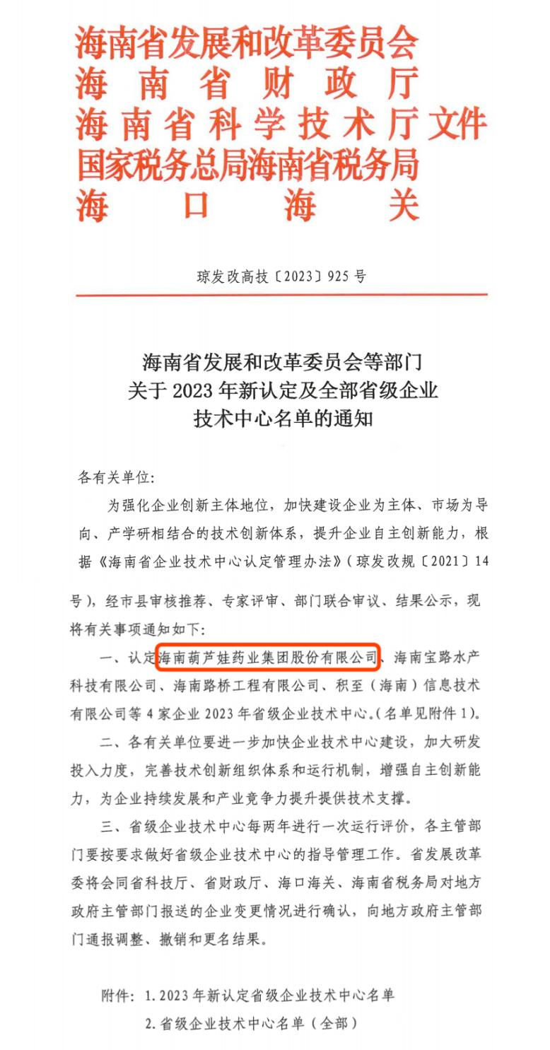 近日,海南省发改委等多部门联合公布了《关于2023年新认定及全部省级企业技术中心名单的通知》,其中,海南尊龙凯时药业集团股份有限公司成功通过评审,被认定为省级企业技术中心,是本次获批的4家企业之一。